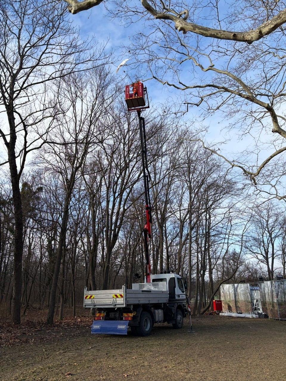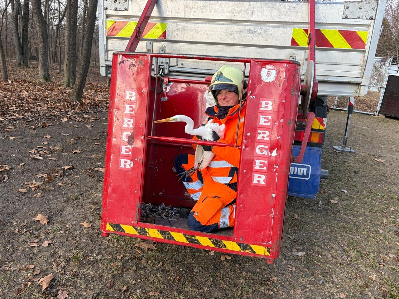 Nach Beurteilung der Lage wurden Mitarbeiter mit einem LKW und Arbeitskorb der Marktgemeinde Laxenburg, welche gerade in der Nähe mit Arbeiten beschäftigt waren, zur Unterstützung angefordert. Durch einen Feuerwehrmann wurde festgestellt, dass sich der Vogel in einer Schnur am Baum verhängt hatte. Durch Lösen der Schnur konnte der Reiher aus rund 13 Meter Höhe befreit und zu Boden gebracht werden.